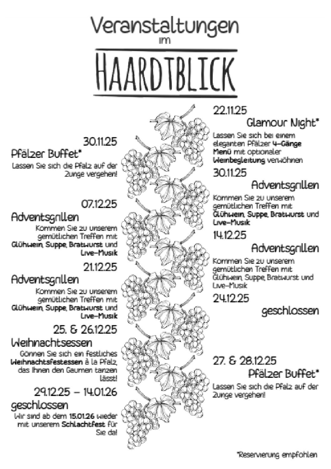 Genießen Sie in unserem Restaurant Haardtblick gepflegte Gastlichkeit in gemütlicher Atmosphäre bei traditioneller Pfälzer Küche und ausgesuchten Weinen. Bei uns treffen sich Freunde, Familien, Gleichgesinnte und solche, die es werden wollen.